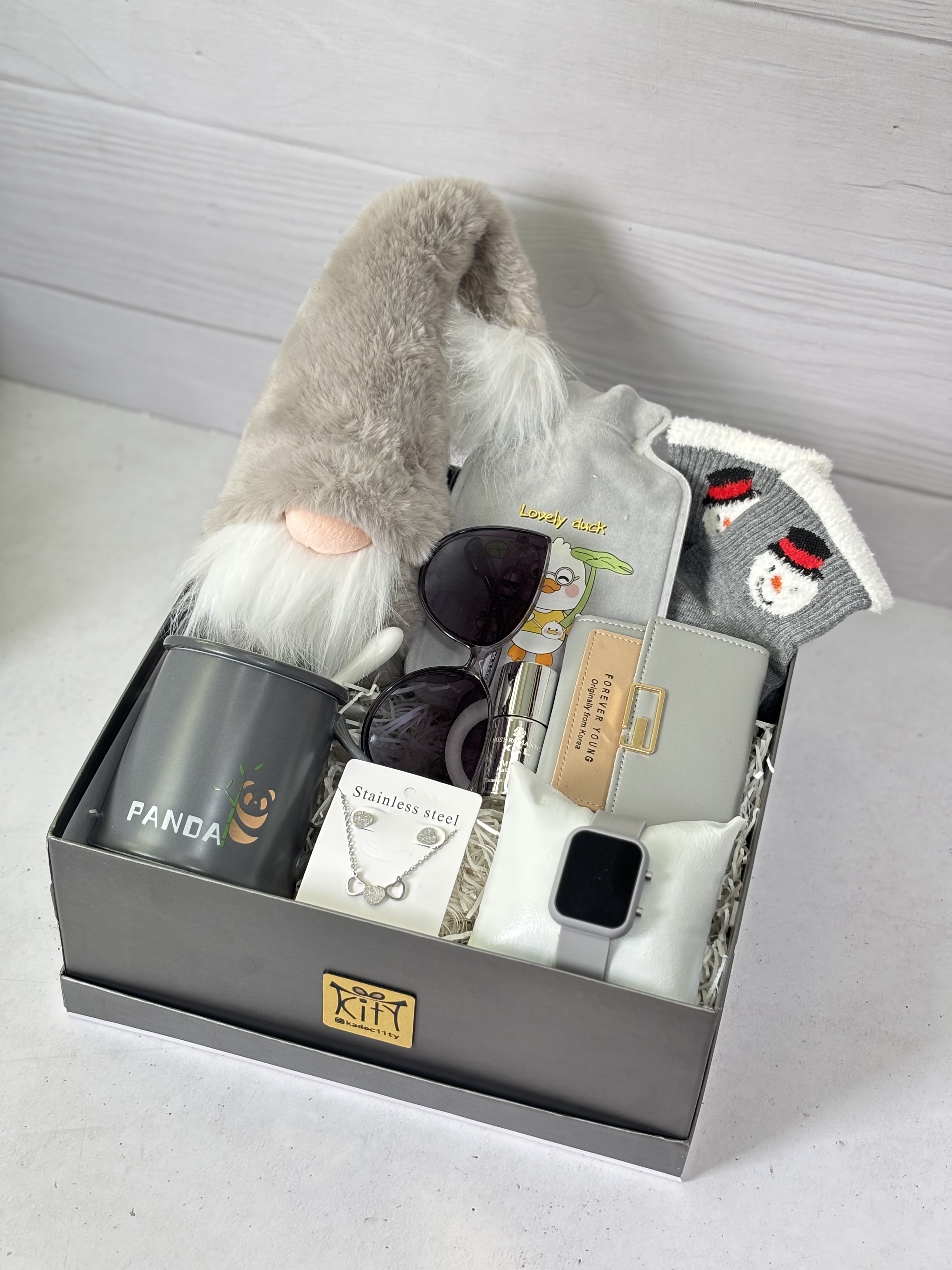 این باکس شامل:عروسک لی لی پوت،عینک آفتابی،کیسه آبگرم مخملی،ماگ،ساعت دیجیتالی،جوراب،کیف پول جیبی،نیم ست،ماگ پاندایی قاشق دار و درب سرامیکی،لاک آینه ای و باکس و پوشال میباشد.