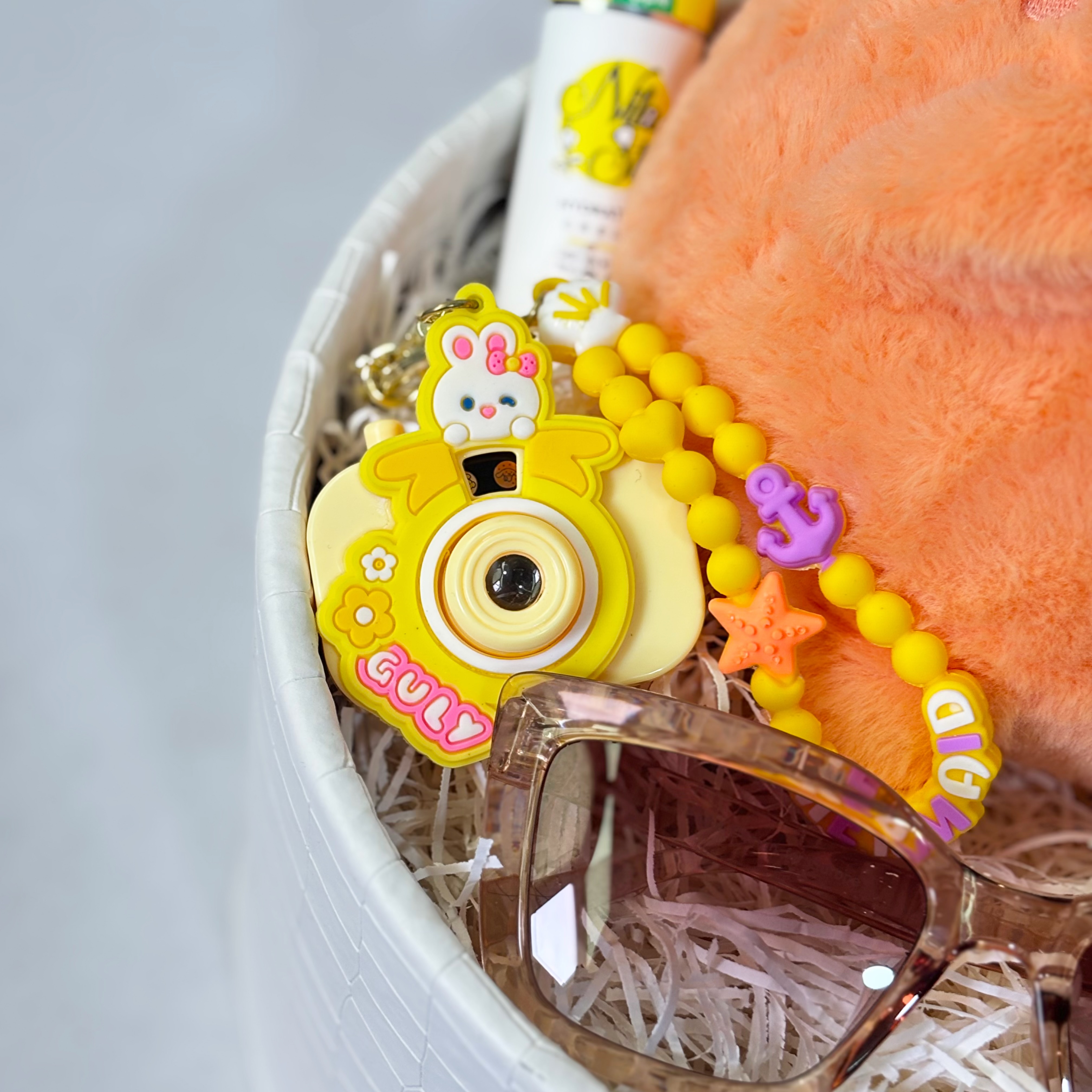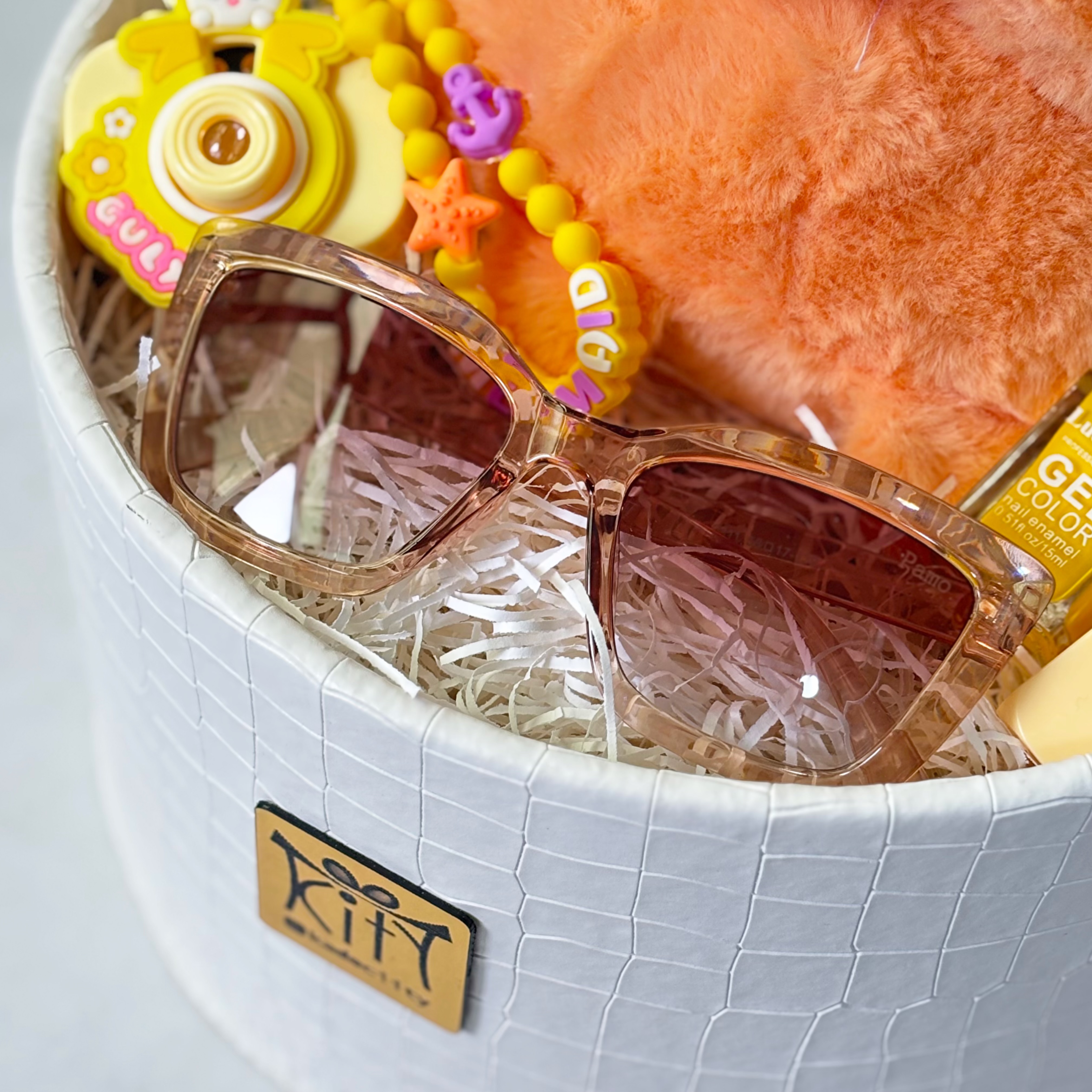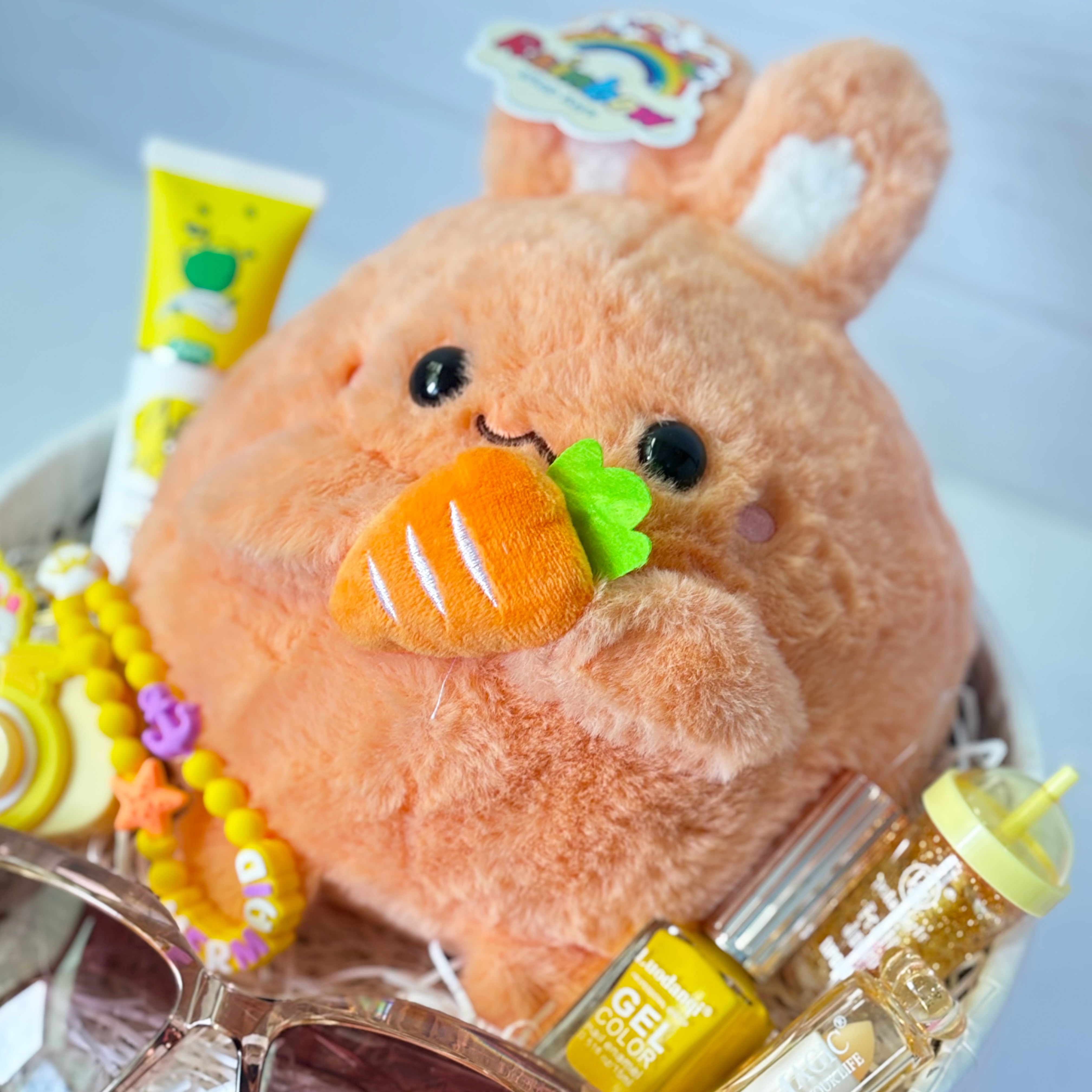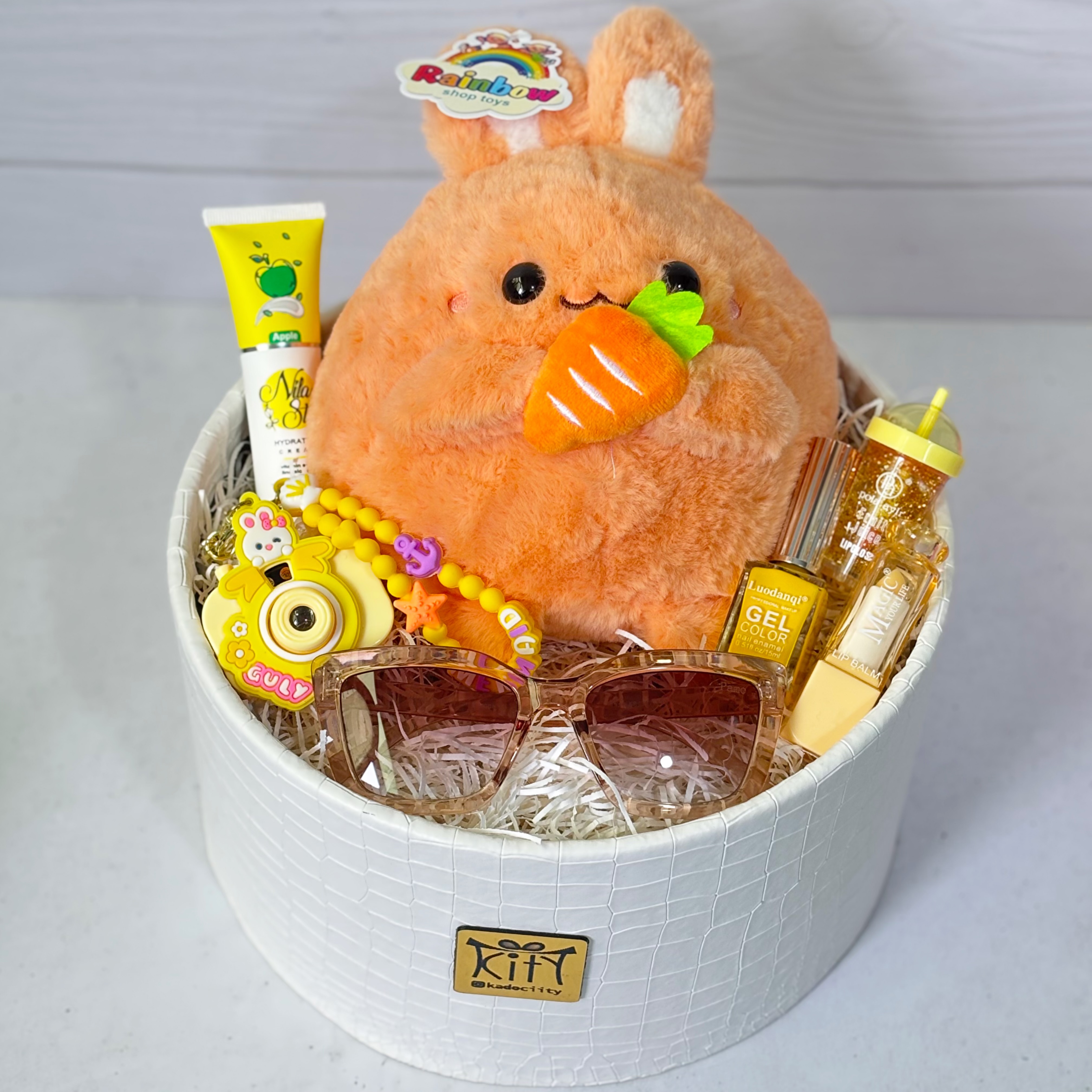 این باکس شامل:عروسک خارجی خرگوش،عینک آفتابی،جاسوییچی دوربین فانتزی،کرم مرطوب کننده ، لاک، بالم لب، برق لب و باکس و پوشال میباشد.