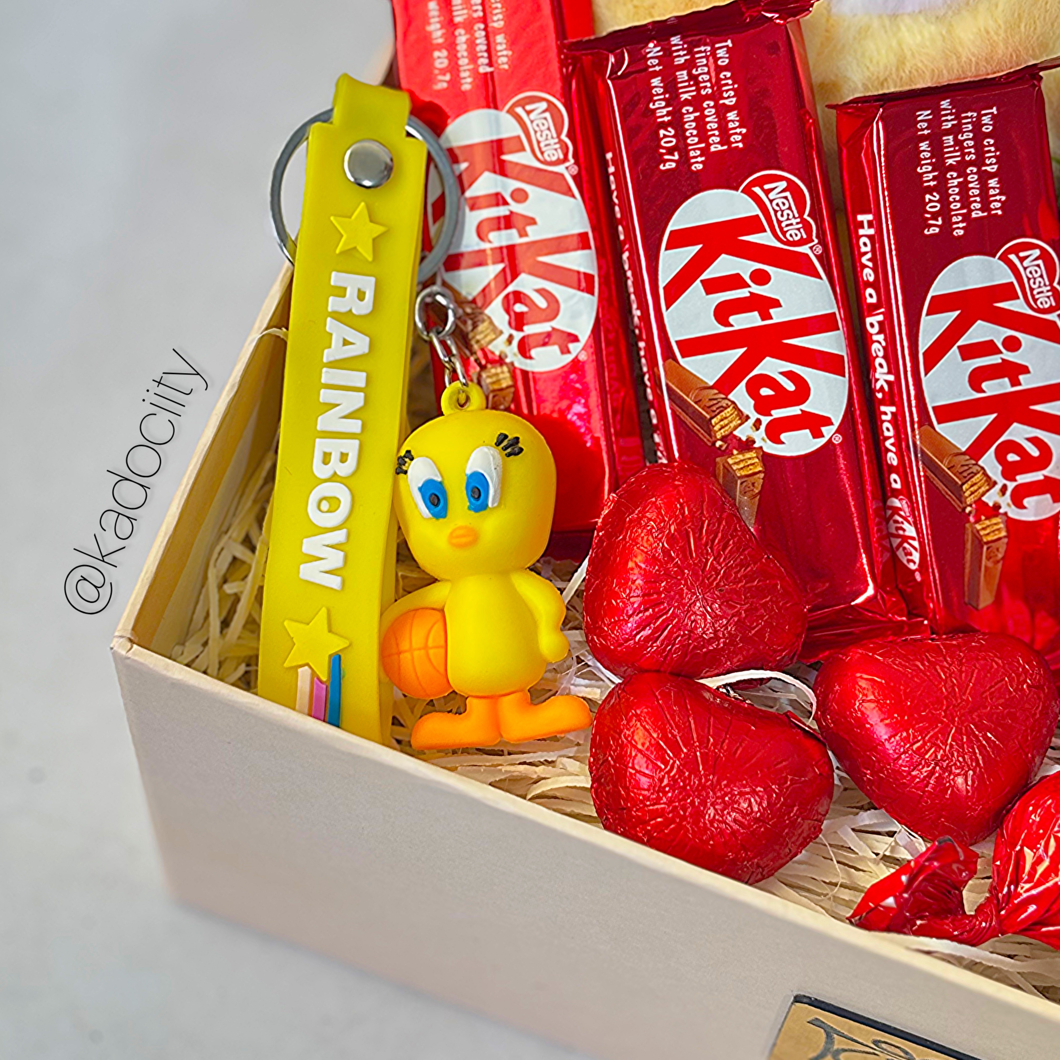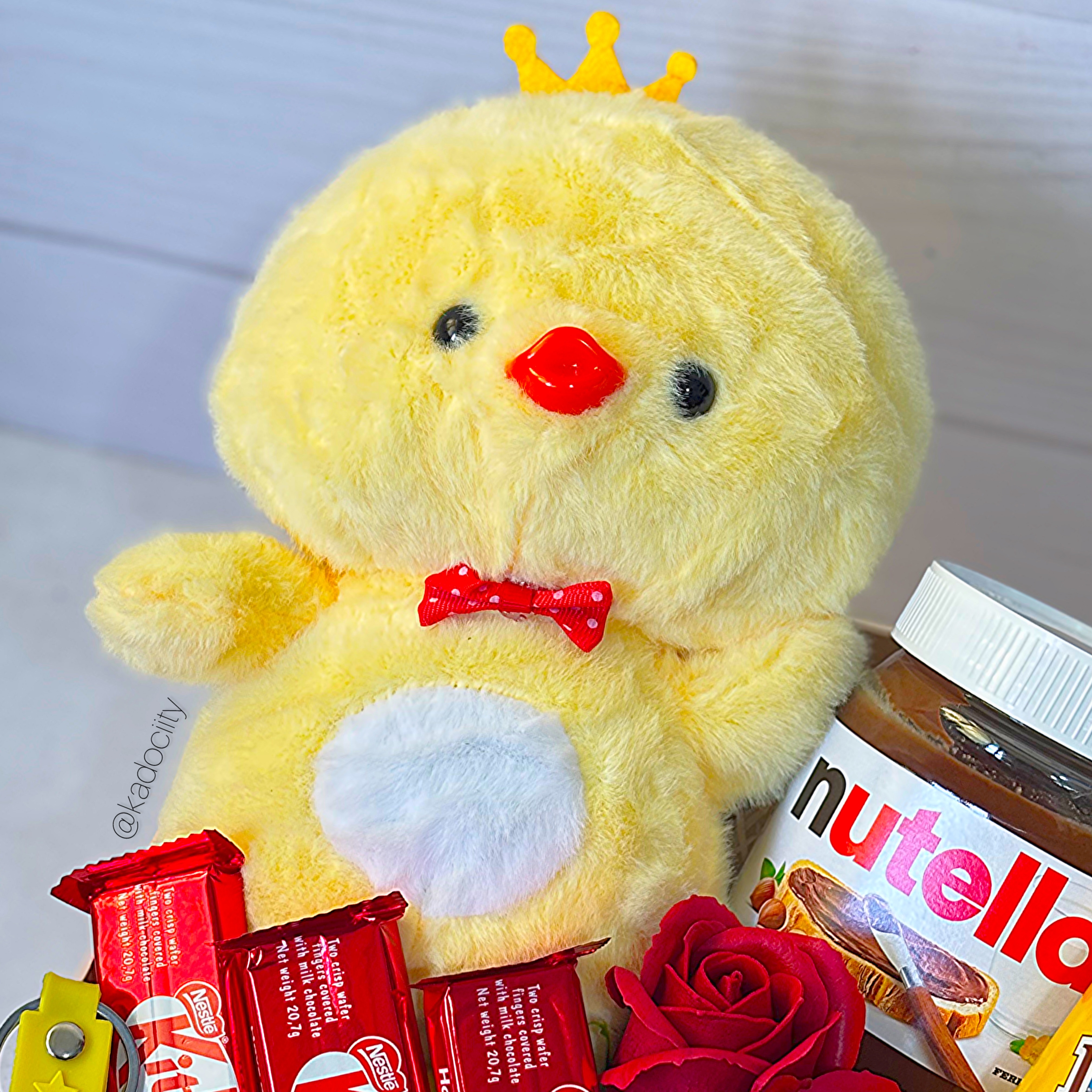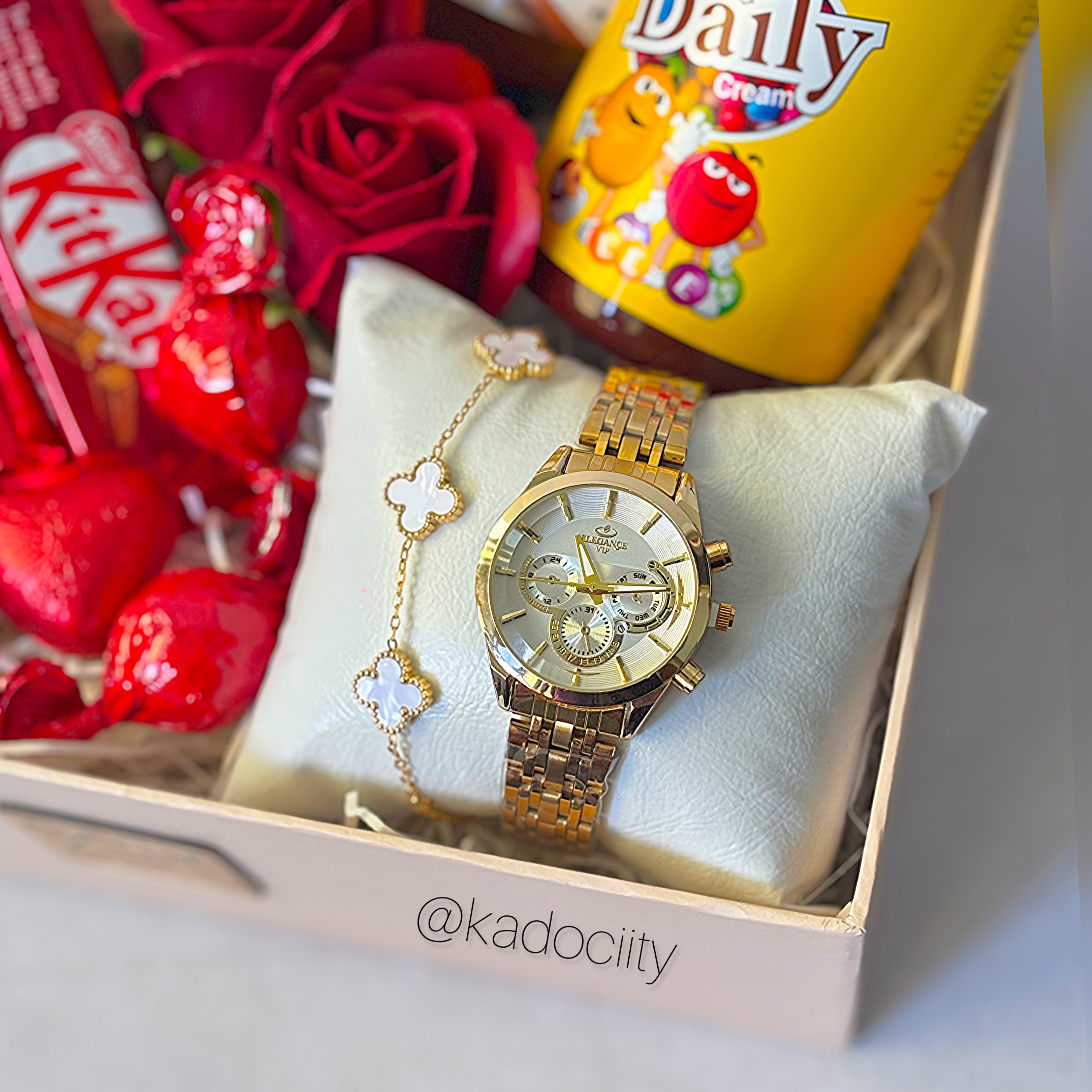 این باکس شامل:عروسک جوجه، نوتلا ،کرم مرطوب کننده پمپی، ساعت الگانس Vip، دستبند ونکلیف، جاسوییچی جوجه، دوعدد گل معطر، سه عدد شکلات خارجی کیت کت، دوعدد شکلات توپی، سه عدد شکلات قلبی و باکس و پوشال میباشد.