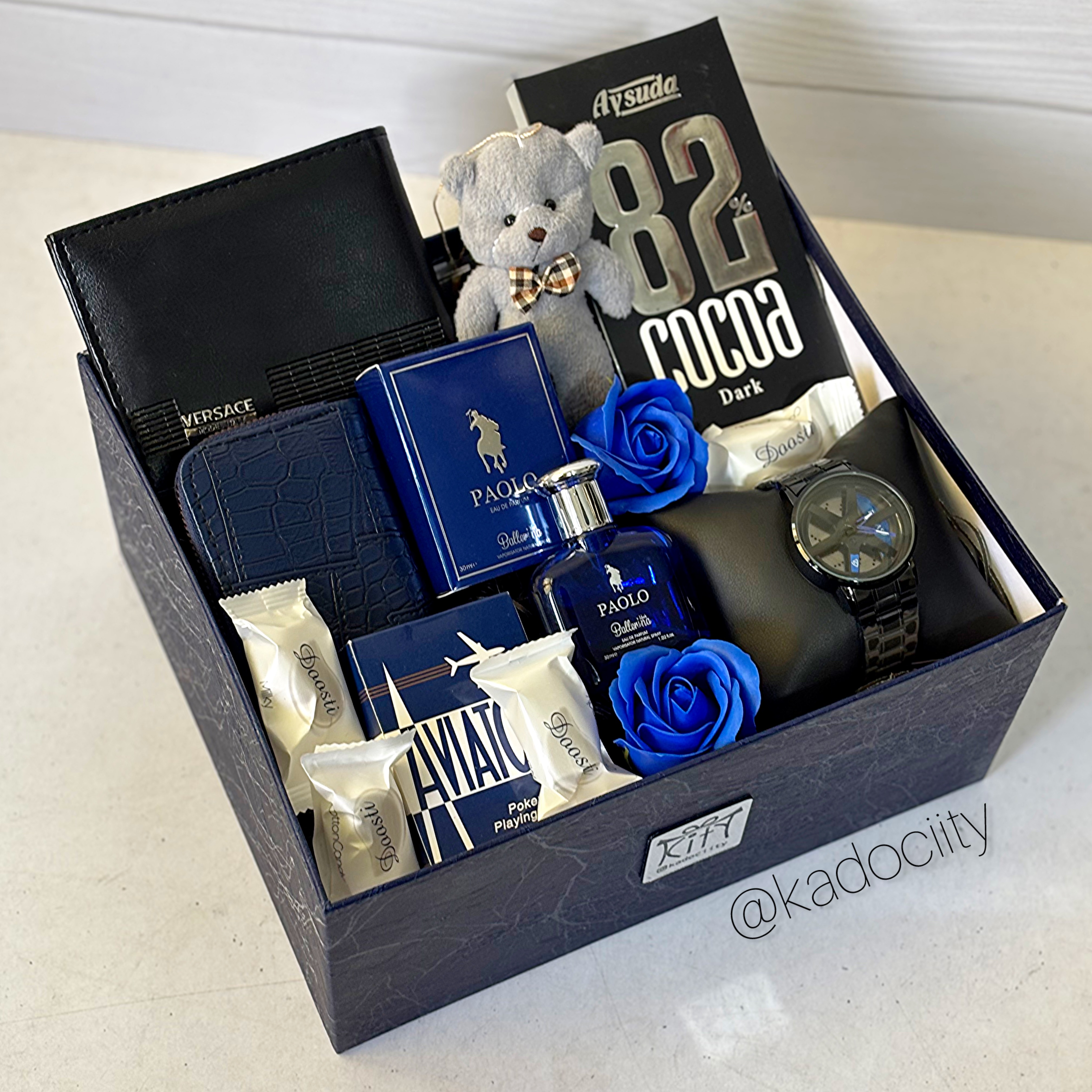 این باکس شامل:ساعت رینگی، ادکلن، عروسک خرسی ،کیف پول، جاکارتی آکاردئونی، پاسور، شکلات تخته ۸۲٪، دو عدد گل معطر، ۴ عدد شکلات، ریسه نوری و باکس و پوشال میباشد.