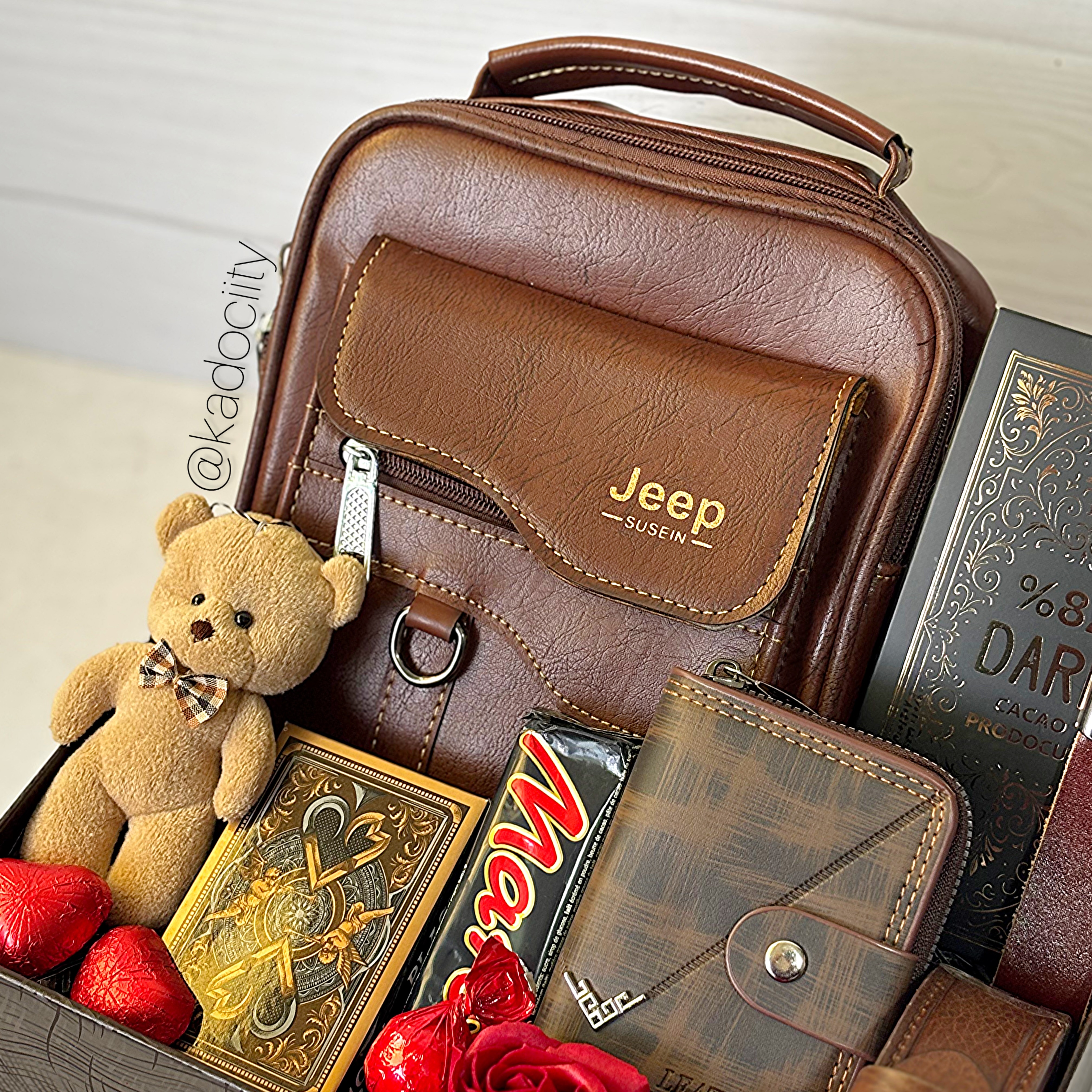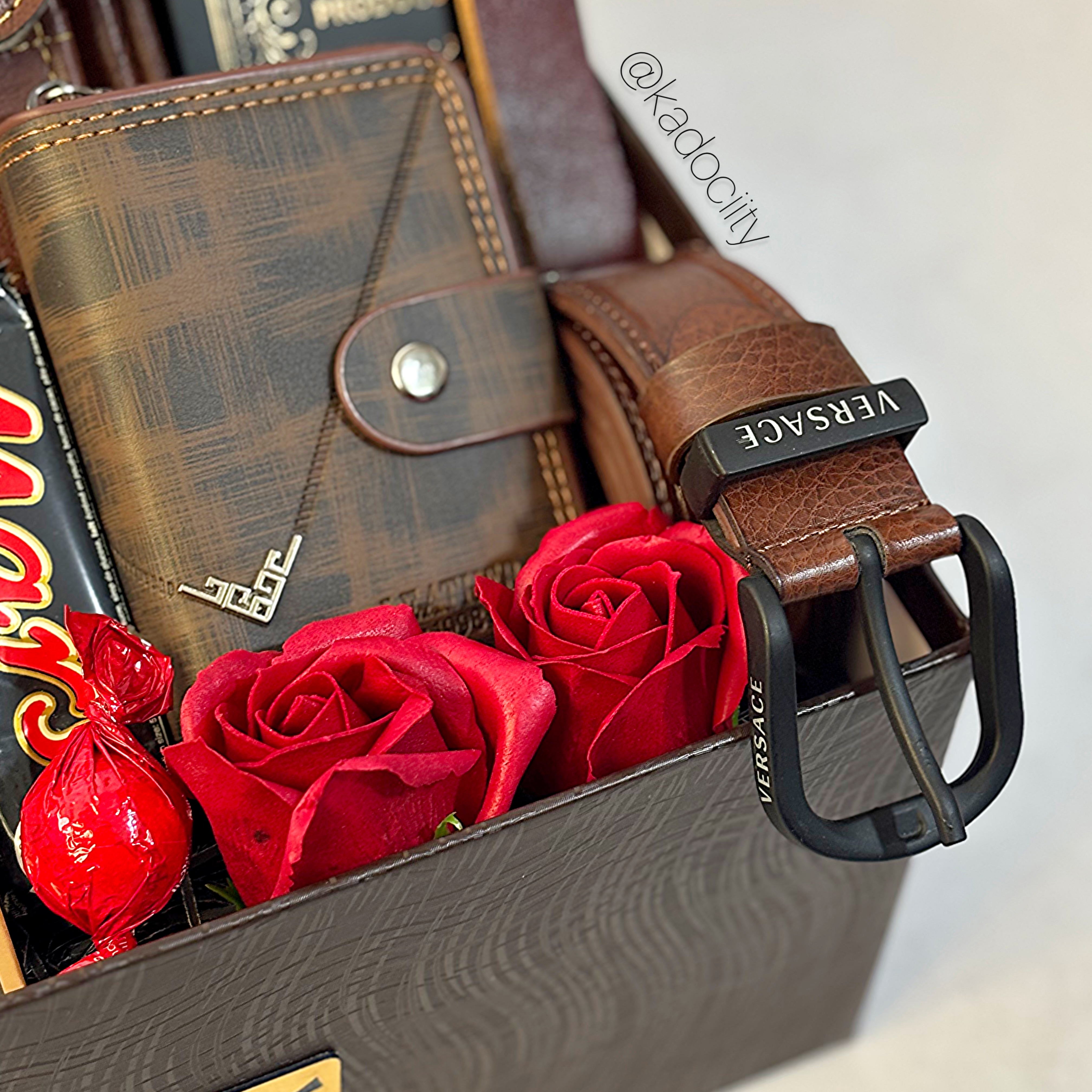 این باکس شامل: کیف دوشی چرم مصنوعی، کمربند ، شکلات تخته ای،جا سوئیچی چرم طبیعی، جاکارتی چرم خارجی، پاسور، عروسک خرسی، یک عدد شکلات خارجی مارس، دوعدد گل معطر، دوعدد شکلات قلبی،یک عدد شکلات توپی و باکس و پوشال میباشد.