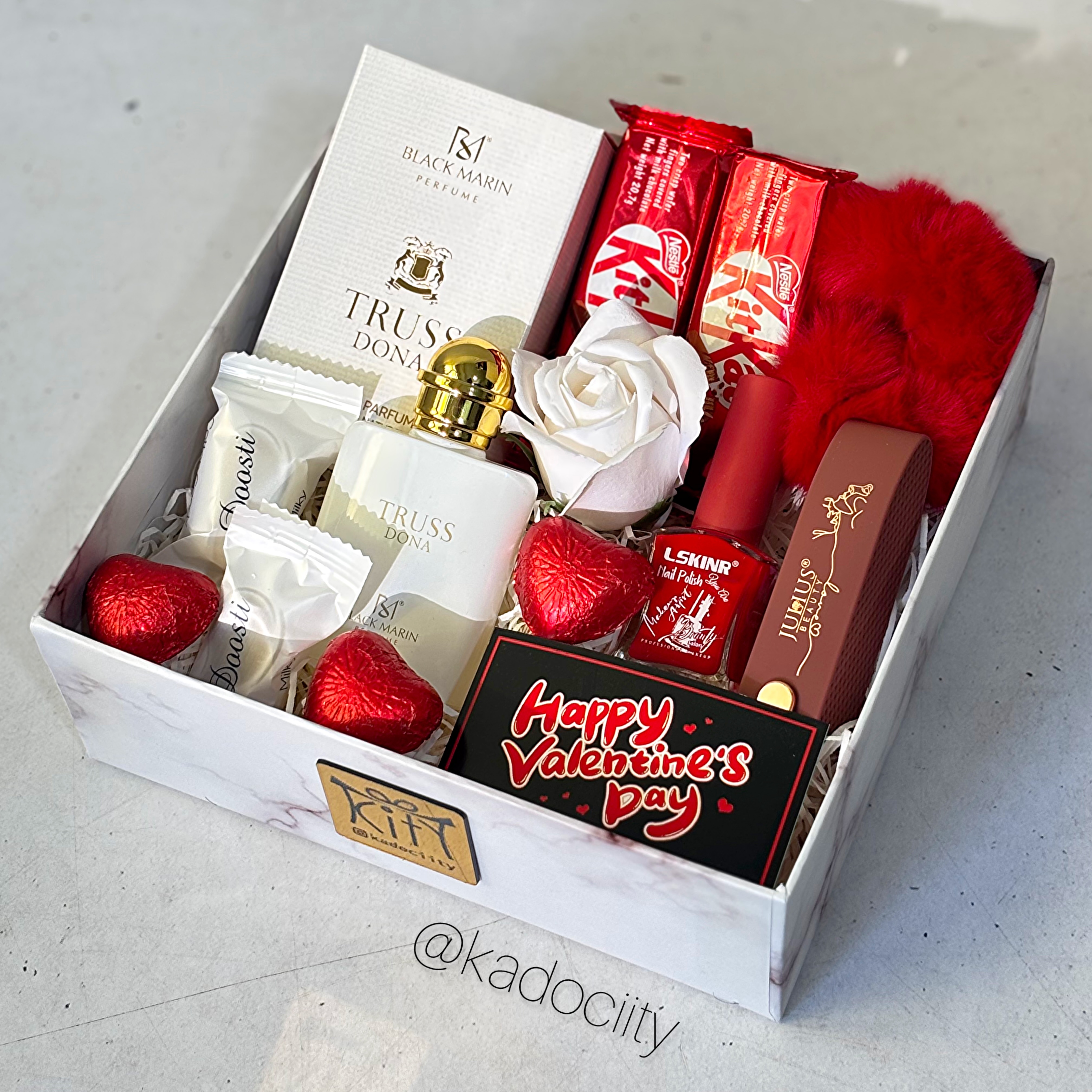 این باکس شامل ادکلن مینیاتوری، لاک، رژلب جامد، کش مو پشمالو،دوعدد شکلات خارجی کیت کت، سه عدد شکلات قلبی، دوعدد شکلات سفید، گل معطر ، کارت هپی ولنتاین و باکس و پوشال میباشد.