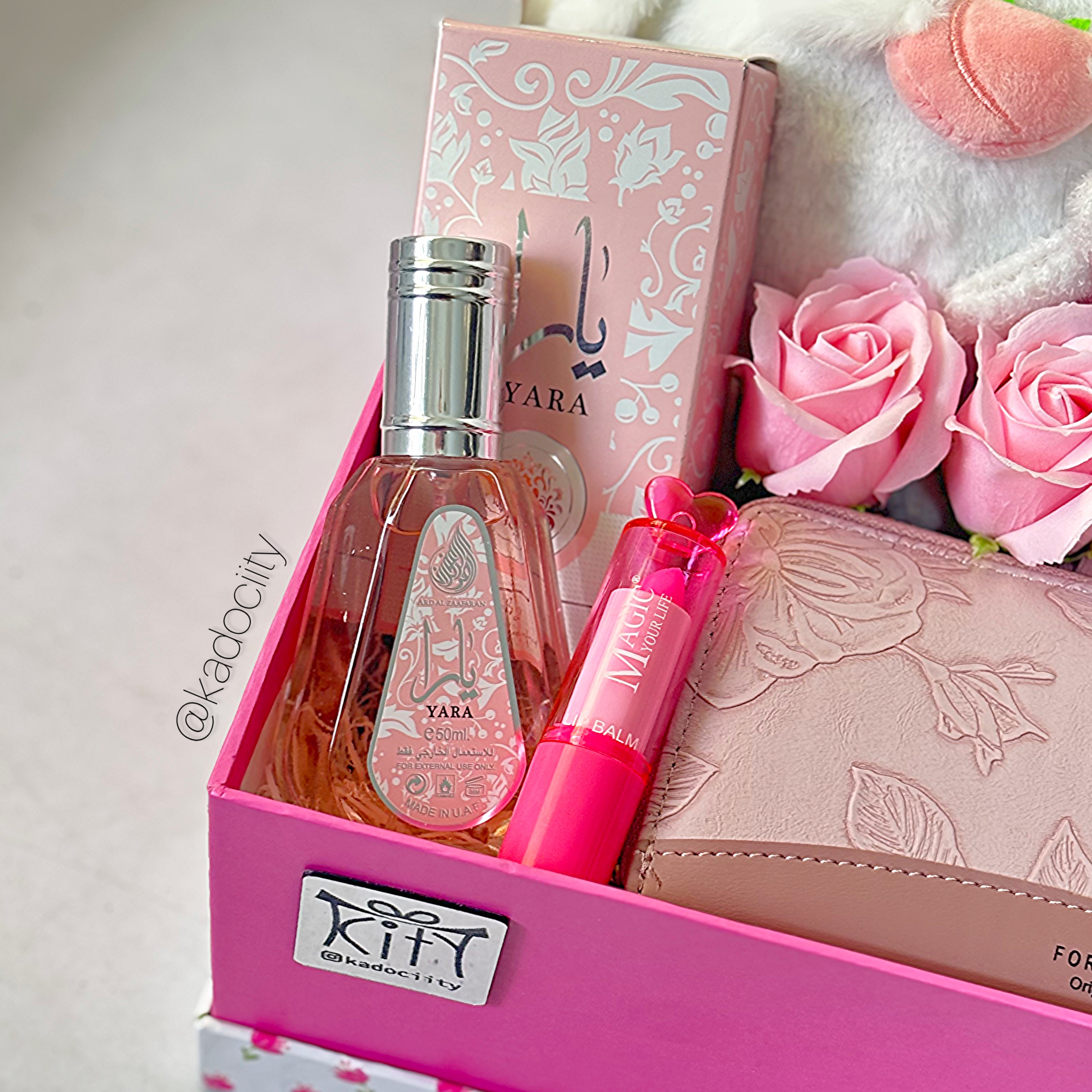 این باکس شامل: عروسک خرگوش هلو به دست، کیف پول دستی چرم خارجی،تراول ماگ ، جوراب، ادکلن،برق لب، جاسوئیچی سیلیکونی،سه عدد گل معطر و باکس و پوشال میباشد.
